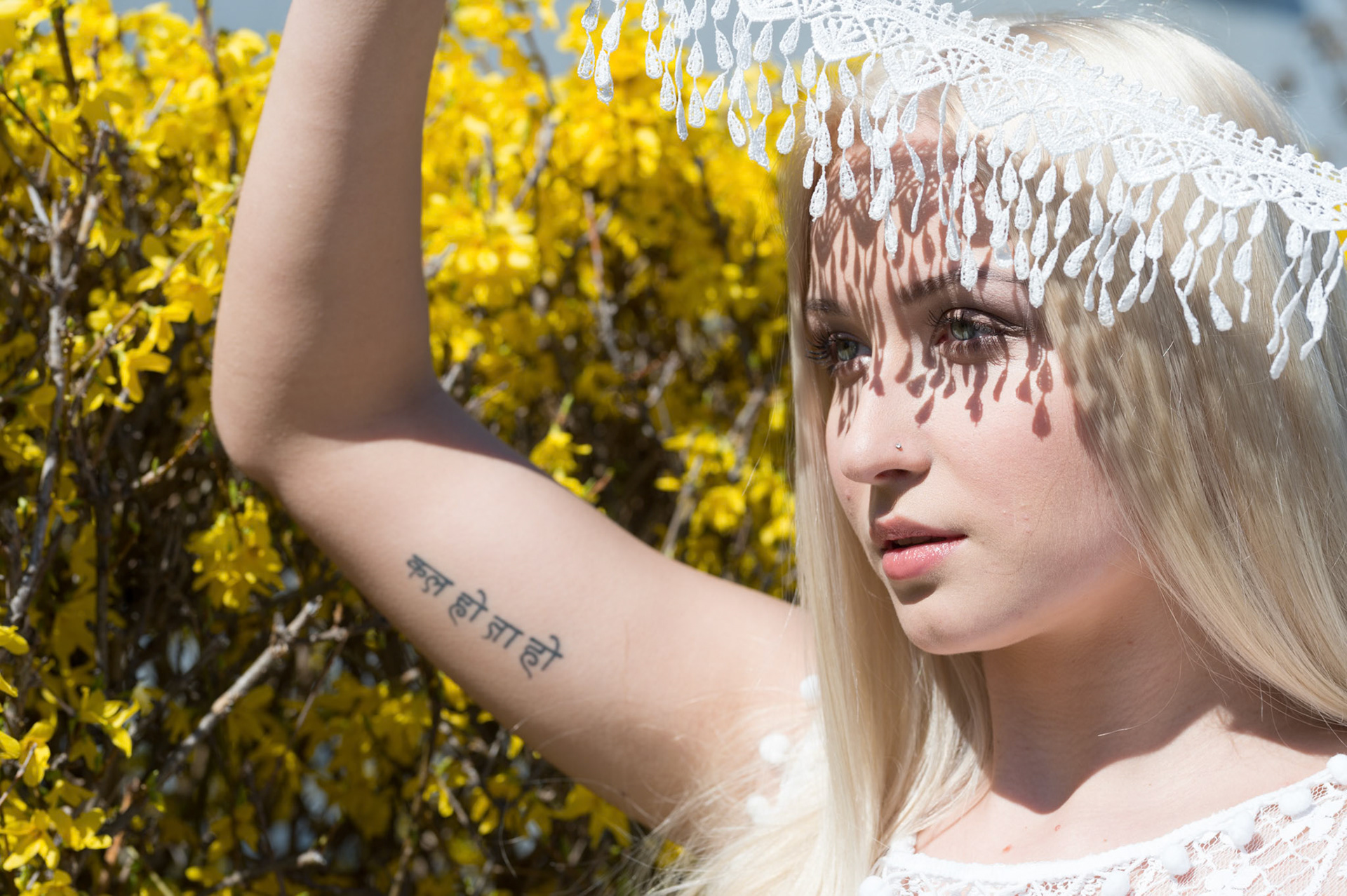 Portrait im Studio einer jungen hübschen Frau langen braunen Haaren und einem Tattoo auf der Brust. Sie blickt direkt zur Kamera.